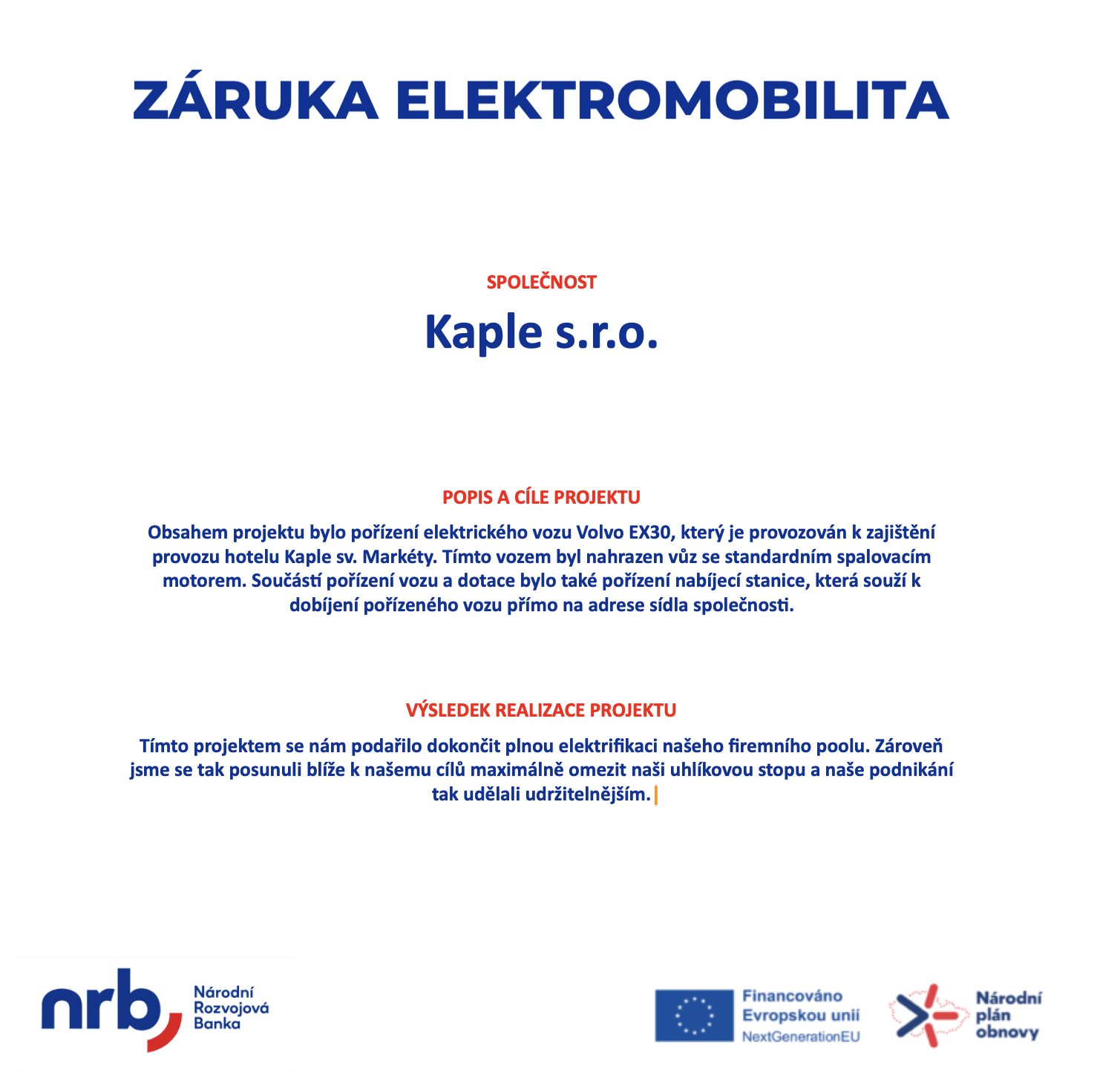 název projektu - Pořízení elektromobilu a dobíjecí stanice do vozového parku společnosti Kaple s.r.o.